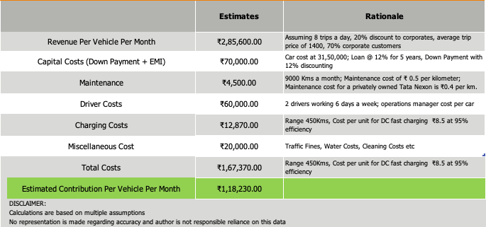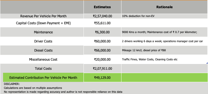 We can also draw a comparison to Innova Crysta. Assuming Crysta costs ₹25,00,000 on the road in Bengaluru, under the same high asset utilization model, we would get a contribution margin of ₹50,000 per month.