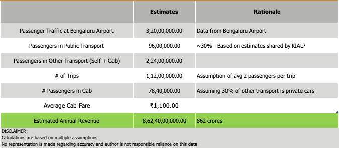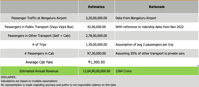 Shoffr's current focus is the airport taxi market. This market size, based on a back-of-envelope calculation, is anywhere between ₹ 850 crores (conservative) to ₹1250 crore (optimistic) for Bengaluru in 2023.